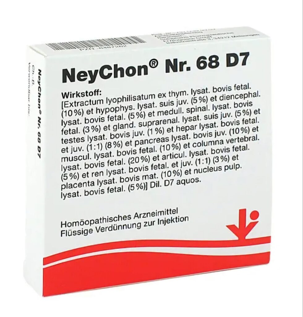 Состав Нейхон № 68: Действующее вещество: [Экстракт лиофилизата экс тим. лизат. плод крупного рогатого скота. (10%) et hypophys. лизат. suis juv. (5%) et диэнцефал. лизат. плод крупного рогатого скота. (5%) и др. мозговое вещество. спинной мозг, лизат. плод крупного рогатого скота. (3%) и др. супраренал, лизат. suis juv. (5%) и др. лизат яичек. молодняк крупного рогатого скота. (1%) и др. Лизат печени. плод крупного рогатого скота и др.. (1:1) (8%) и др. лизат поджелудочной железы (10%) и др. мышечный. лизат. плод крупного рогатого скота. (10%) et columna vertebral, лизат. плод крупного рогатого скота. (20%) et articul. лизат. плод крупного рогатого скота. (5%) и др. лизат. плод крупного рогатого скота и др.. (1:1) (3 %) и др. лизат плаценты. бовис мат. (10%) и др. пульпа ядра. лизат. плод крупного рогатого скота (5%).